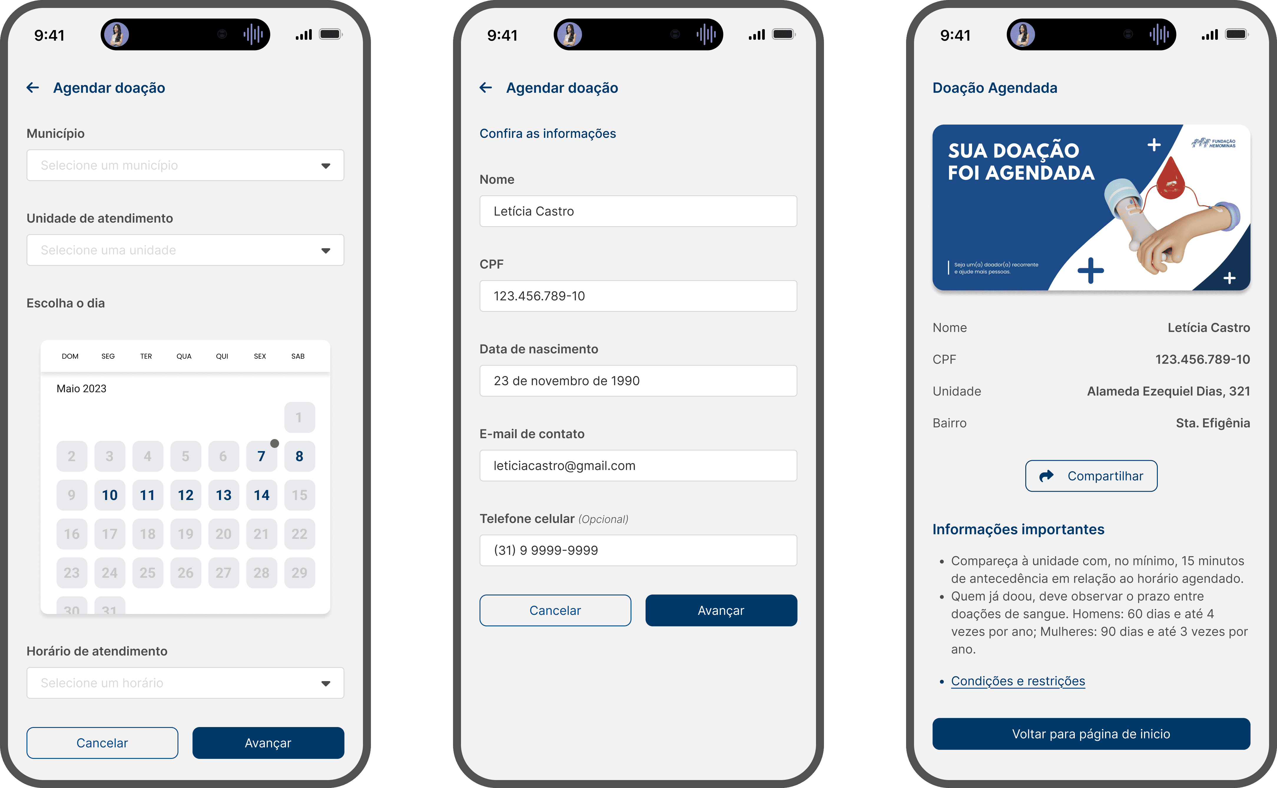Beyond a beautiful group-built campaign, I contributed to the development of this project, aiming to simplify scheduling and clarify doubts about the blood donation process.